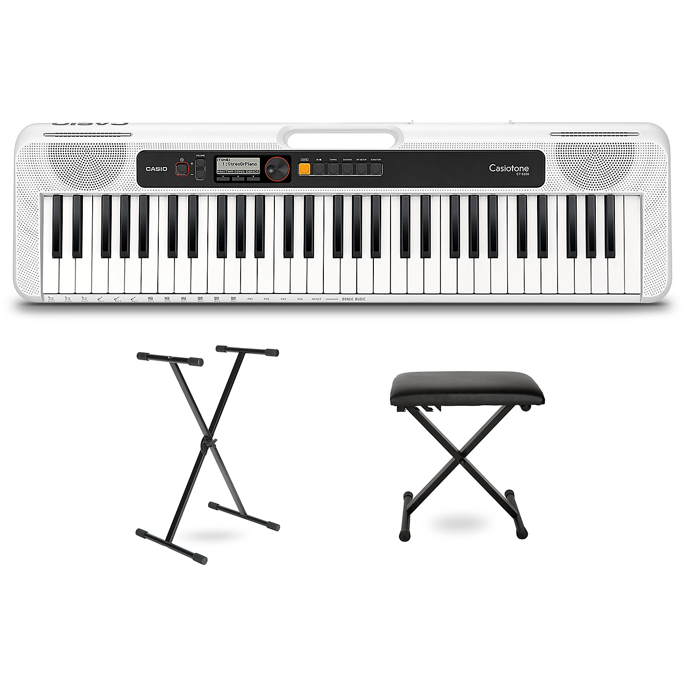 This kit includes:Casio Casiotone CT-S200 61-Key Digital Keyboard BlackIn 1980, Casio made music creation available to everyone, everywhere with the very first Casiotone portable keyboard. The CT-201 was the first electronic keyboard with full-size keys that anyone could afford. It launched a legacy of giving musicians of any age, budget, or skill level the innovations that help them sound their best. Now, nearly 40 years later, Casio proudly presents the next generation of Casiotone keyboards. Featuring 400 tones and 75 rhythms, the Casiotone CT-S200 is the perfect first step, the perfect gift, and the perfect way to have fun making music. The ultra-compact CT-S200 lets you make music wherever and whenever you want. Just pop in six AA batteries, grab the built-in carrying handle and take your inspiration to go.Compact and portableThe ultracompact CT-S200 lets you make music wherever and whenever you want. Just pop in six AA batteries, grab the built-in carrying handle and take your inspiration to go.Tones and rhythmsExplore a variety of great sounding Tones and accompaniment Rhythms with an easy-to-read LCD display and simple controls. Press the “My Setup” button to quickly get to your favorite Tone and Rhythm.Dance Music ModeDance Music Mode lets you easily create and remix EDM tracks. Select a style, and use the keys to trigger drum loops, basslines, synth parts, effects, transitions and more.Built-in speakersUse the built-in speakers to share with friends, or plug in headphones for quiet play at any time. The 1/8” audio input lets you play along with music from your favorite device.Chordana Play appConnect to the free Chordana Play iOS/Android app and take your music further, learning how to play your favorite songs from downloaded MIDI files. The class-compliant USB port connects to any Mac/PC/Android device with no drivers needed.Musician’s Gear Padded Piano BenchThe Musician’s Gear padded piano bench has an X-bracing with black finish, adjustable height in three increments. The faux leather seat is generously padded.Musician’s Gear KBX1 Single-Braced Keyboard StandThe Musician’s Gear KBX1 single-braced keyboard stand is the ideal and affordable stand for small and medium-weight keyboards. Its six adjustment settings provide a custom setup for optimal placement, while its spring-loaded handle offers quick, on-the-fly changes. Made with heavy-duty steel construction and non-slip rubber end caps, your instrument stays where you put it.