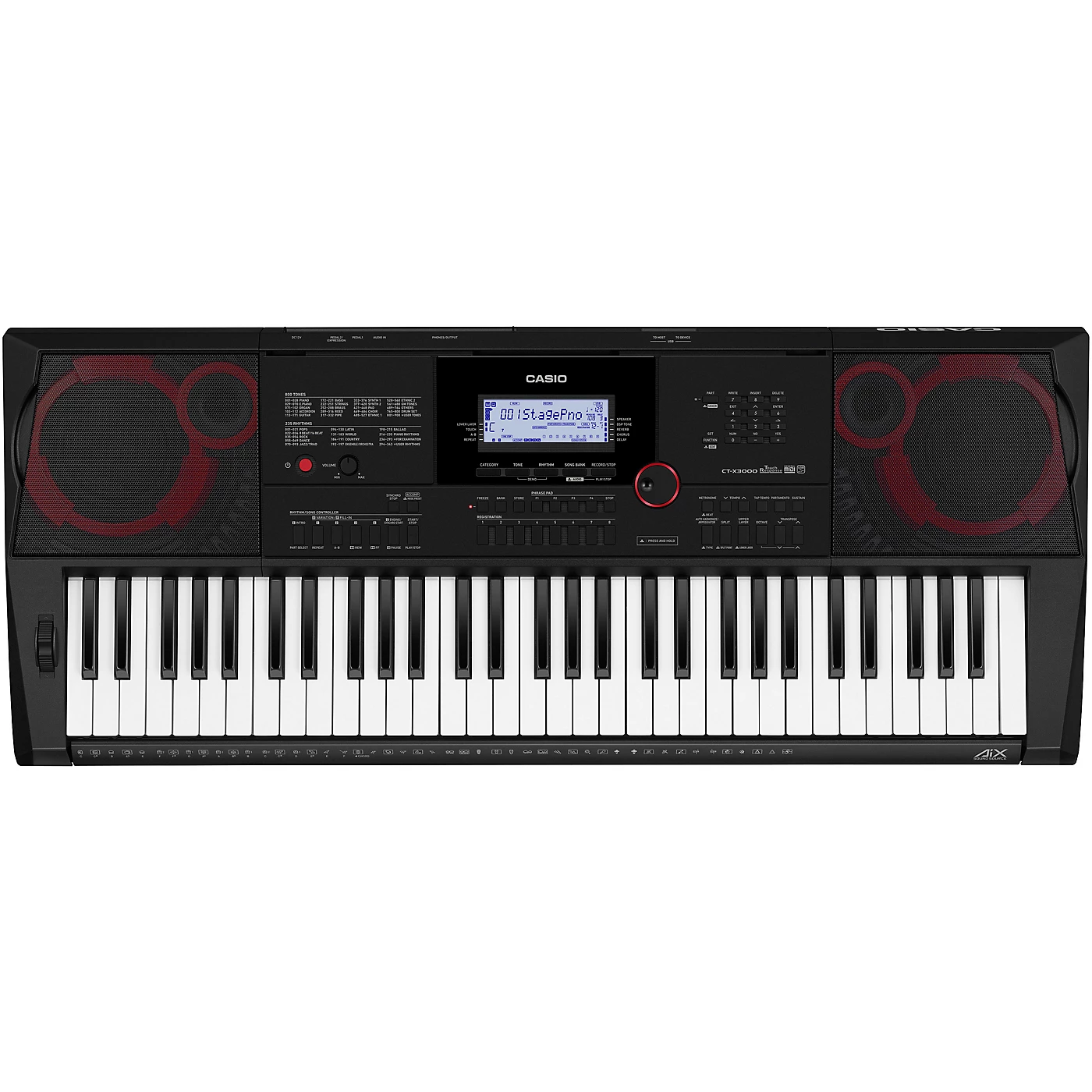 Wherever you are on your musical journey, and no matter your budget, you shouldn’t have to compromise on sound quality. Meet the CT–X3000. Its stunning sound makes it a must-have for keyboardists of any level who need a portable instrument. What truly sets the CT–X3000 apart from other portable keyboards is its heart: The powerful AiX Sound Source. This technology makes the CT–X3000 sound like a keyboard costing hundreds, if not thousands of dollars more.Use the Category button to explore the 800 Tones, and in each category you’ll find an incredible variety of lifelike instruments that go far beyond your expectations. You can also edit the Tones, adjusting parameters like attack, release, filter cutoff and resonance. The CT-X3000 has 100 powerful DSP effects, including phasers, flangers, rotary speaker simulation, dynamics processing, and much more. These effects are preset for the included Tones, and can be extensively modified so you can dial in the perfect sound.With hundreds of built-in Rhythms, you’ll always have a band ready to jam. The variety of Rhythms spans the globe as well as the history of popular music. Each Rhythm includes four variations, and can be edited to suit your needs. You’ll find old favorites and chart-topping hits, all played with incredibly realistic instruments that sound better than ever. The drum kits come alive with authentic acoustic drums, vintage drum machine sounds, and a huge collection of percussion instruments and sound effects.The CT-X3000’s convenient performance features keep you in control. Once you’ve set up the CT-X3000 with your choice of Tones, Rhythms and other settings, you can save a Registration for instant recall right when you need it. There are eight convenient Registration buttons, with 16 banks giving you a total of 128 Registrations that can be quickly selected during your performance. Four Phrase Pads give you instant access to musical gestures, percussion loops, sound effects, or whatever else you need in the moment.When songwriting, you can quickly capture your inspiration with the 17-track recorder, then sculpt your tracks with quantization and other editing tools. The CT-X3000’s class-compliant USB-MIDI port connects to any Mac, PC, Android or iOS device with no drivers or installation needed. The included music rest is designed to support tablets. There is also a USB device port, which can be used to play audio files or save your custom Tones, Rhythms and Songs.The CT–X3000 features a powerful 12-watt speaker system protected by tough metal grills. It’s compact, lightweight and rugged, with a tough molded case. When not using the included AC adapter, the CT-X3000’s optional battery power makes it perfect as a go-anywhere musical partner.
