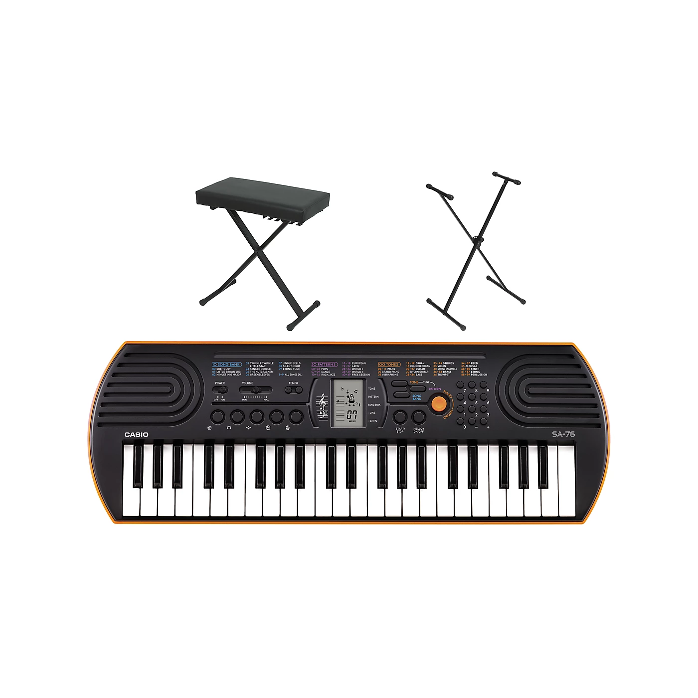 This kit includes the Casio SA-76 keyboard, an On-Stage Stands KS7190 Single-braced Stand, and a Musician’s Gear Deluxe Keyboard Bench.Casio SA-76 KeyboardThe Casio SA-76 is the ideal choice for children to learn the essentials for playing those very first tunes. This 44-key beginner’ keyboard features 100 tones, 50 rhythms, and 10 built-in songs for your child to practice with. The LC display provides you with easy access to all of the instrument’ functions, and the LSI sound source with 8-note polyphony, ensures good sound quality. The SA-76 also includes a striking changeover switch making it easy to switch between piano and organ modes.On-Stage Stands KS7190 SIngle-braced StandThe lightweight and adjustable “X”-style KAS7190 stand is perfect for many of today’s lightweight keyboards.Musician’s Gear Deluxe Keyboard BenchX-style folding throne features supreme comfort from heavy padding and great stability from rubber foot stabilizers. Height adjusts from 21-1/4″ to 25-3/4″. 23-3/5″ wide.