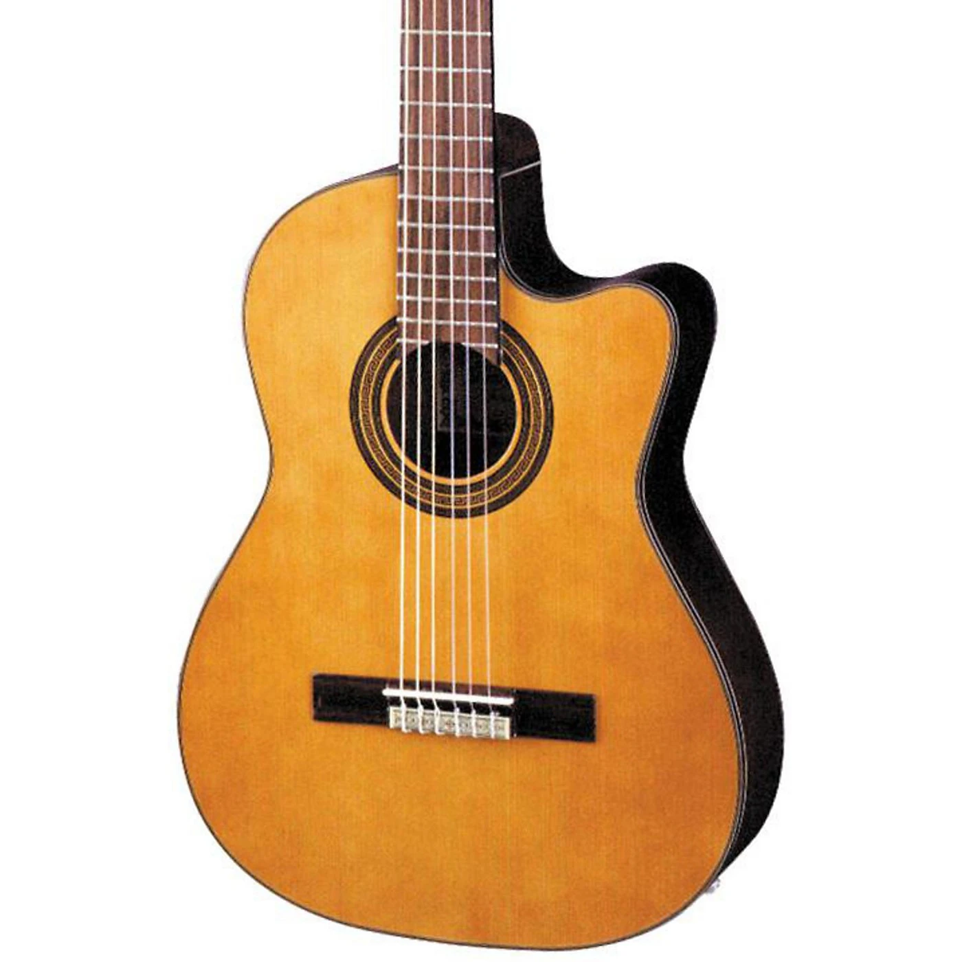 The Ibanez GA6CE Classical-Nylon Acoustic-Electric Guitar is not your traditional nylon-string classical guitar. It steps outside the tradition with a cutaway body, nylon strings, and advanced electronics. It features a spruce top on a mahogany body, rosewood fretboard and bridge, gold hardware, piezo pickup with 4-band EQ, and classical tuning machines.Case sold separately.